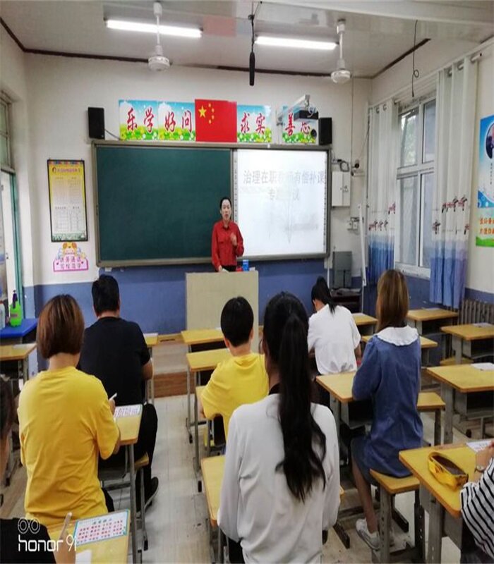 2020年7月10日学校召开治理在职教师有偿补课专题会议。会上,张欣校长首先贯彻落实各级主管部门有关拒绝有偿补课相关文件精神,带领全体教师学习《丛台区教育体育局关于暑假期间严禁在职教师有偿补课的公告》,在全校教师中进一步加强师德师风教育,让每一位教师充分认识本次活动的重要性,明确查处的严厉性和执行的长期性。